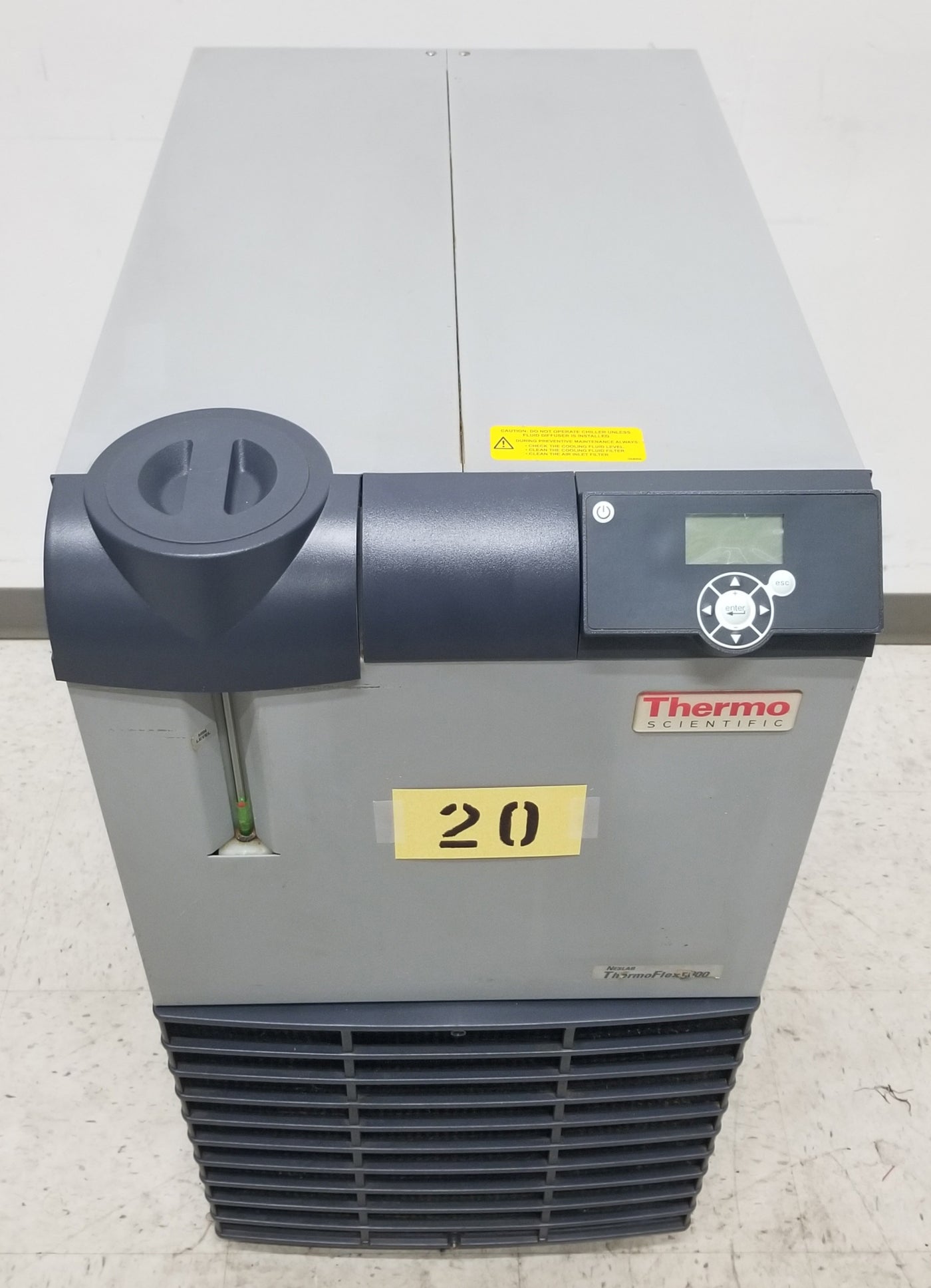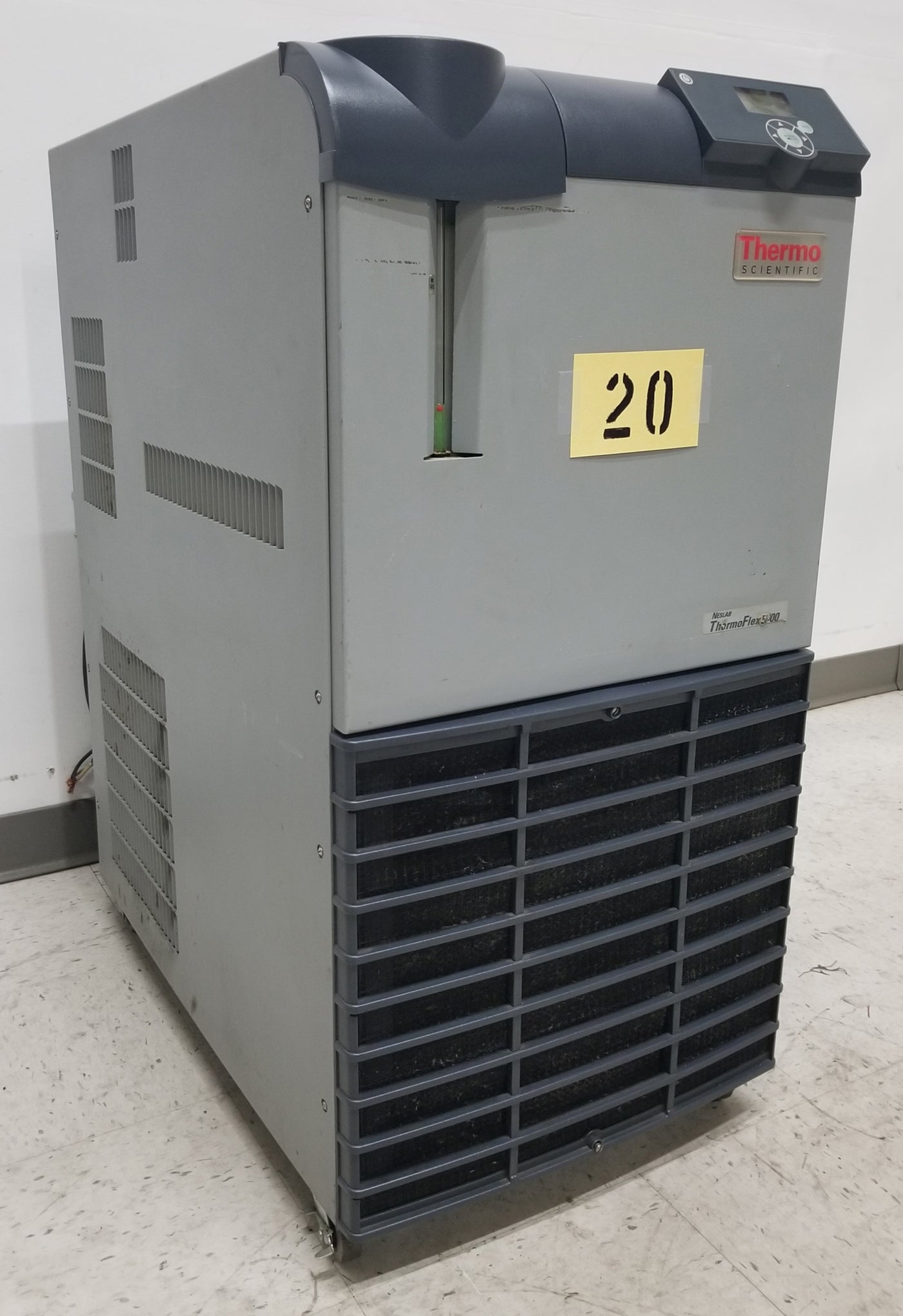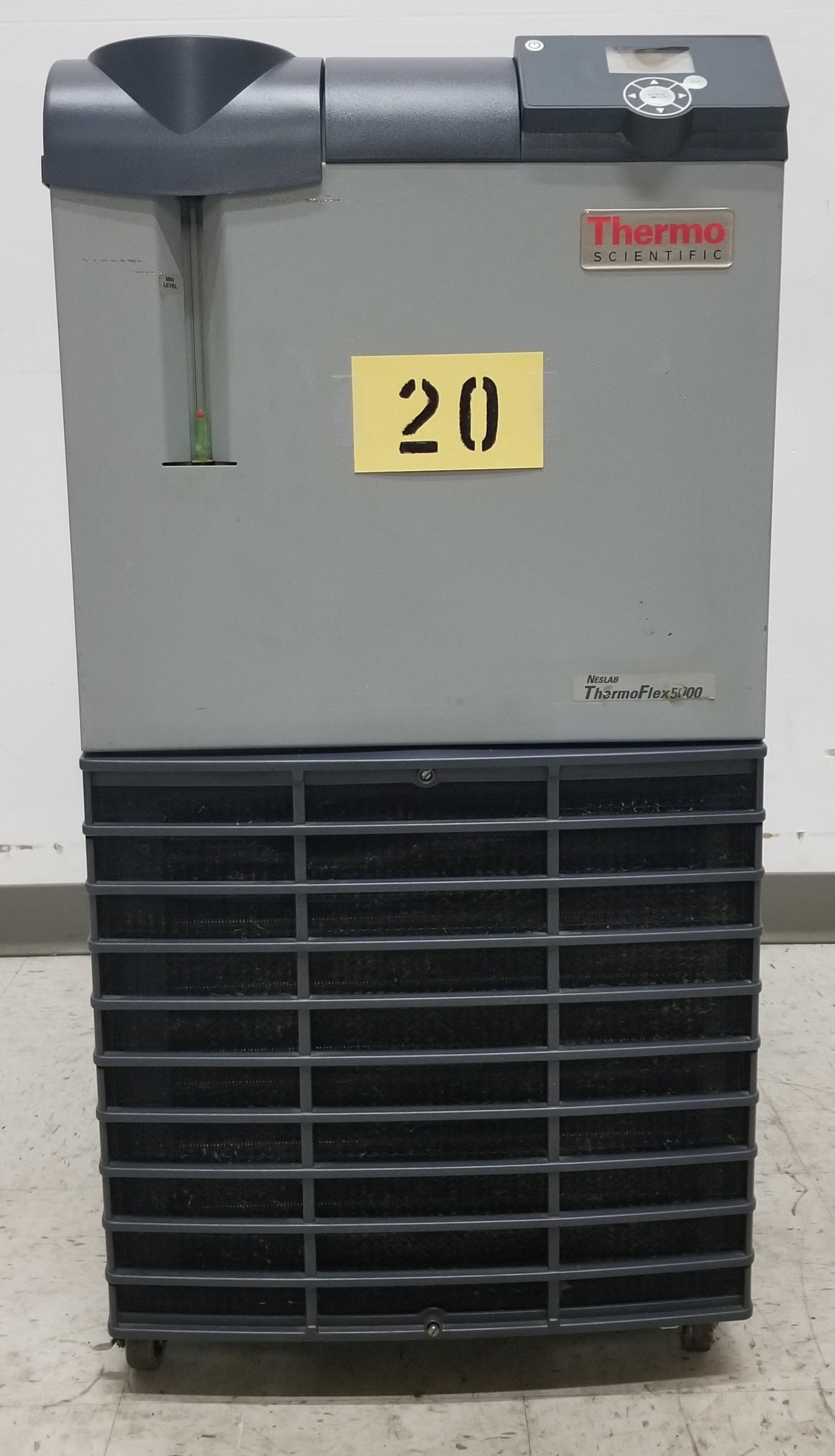 Neslab Thermoflex 5000 Air Cooled Refrigerated Recirculating Chiller. Temperature range +5 to +40°C. Cooling capacity at 20°C 5000 W / 17076 BTU. Pump 8 GPM at 60 PSI. Reservoir volume 1.9 gallons. 208V, 1Ph, 50/60Hz, 25.3A