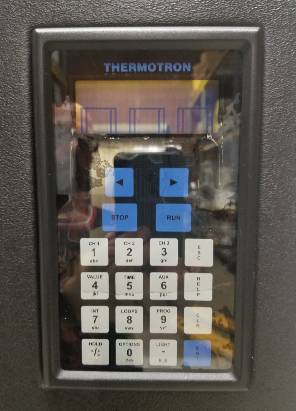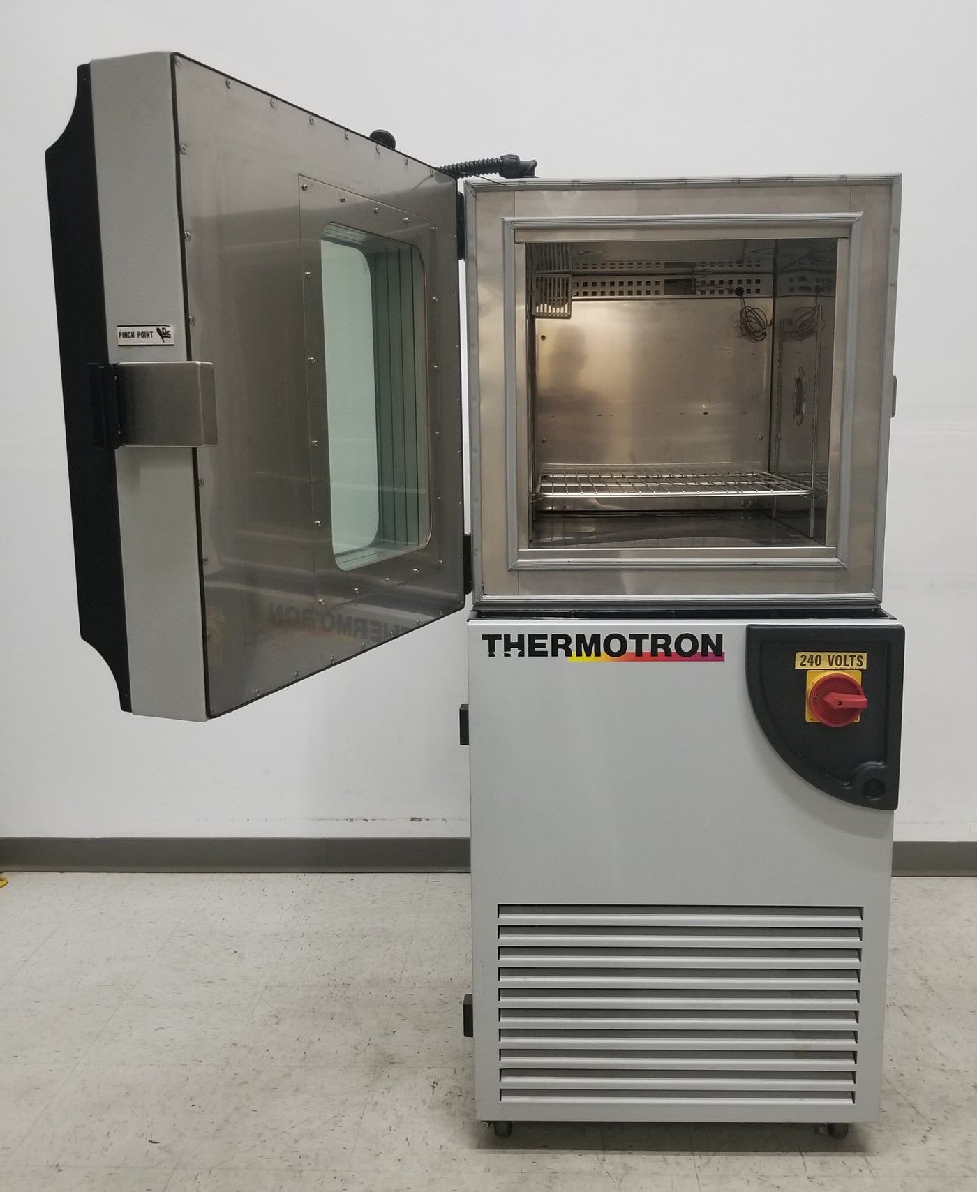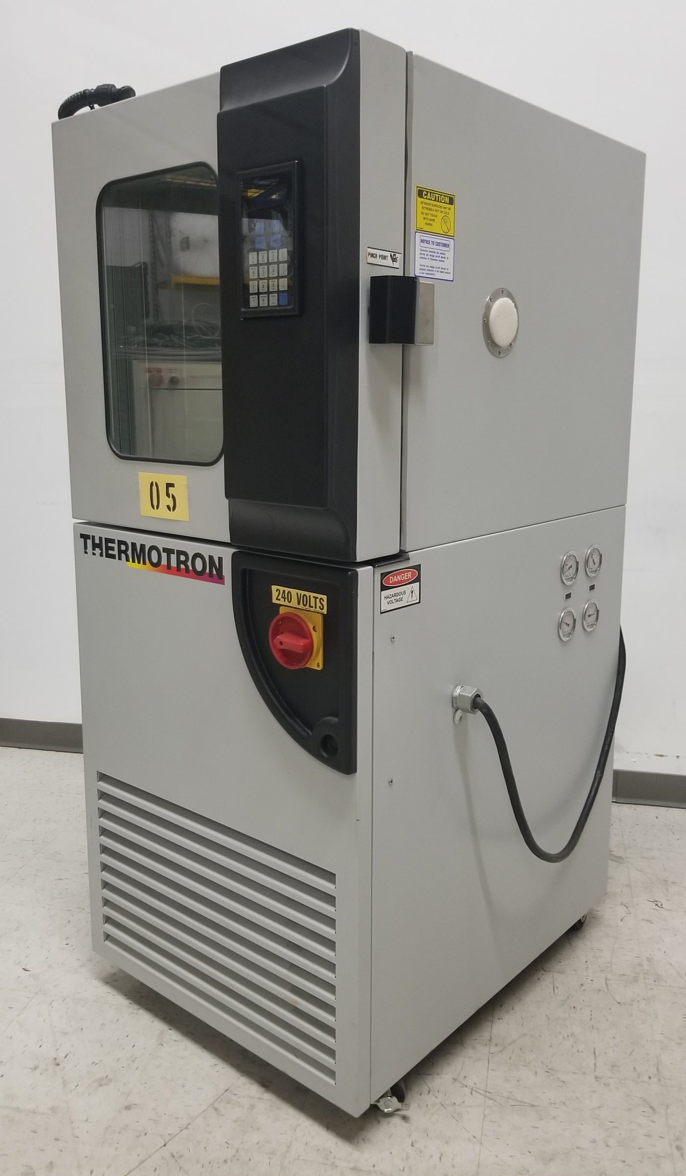 Thermotron’s S-4 Chambers are high-performance chambers with 113 liters of workspace. The efficient refrigeration system provides moderate temperature change rates while allowing the chamber to consume less power than comparable test chambers. Temperature range of -70°C to +180°C. Inside dimensions of 20” x 20” x 20”. Includes two 3” cable ports. Includes optional glass viewport and interior light. 230V, 1Ph, 60Hz, 25A. The 3800 programmable controller displays an interactive touch-sensitive keypad with a four-line display which makes program entry and monitoring easy. A built-in ethernet connection allows for computer interface for PC control and recording test data while the web server feature enables remote access.