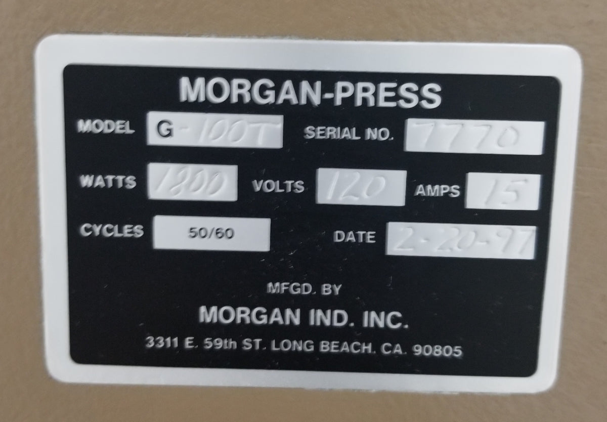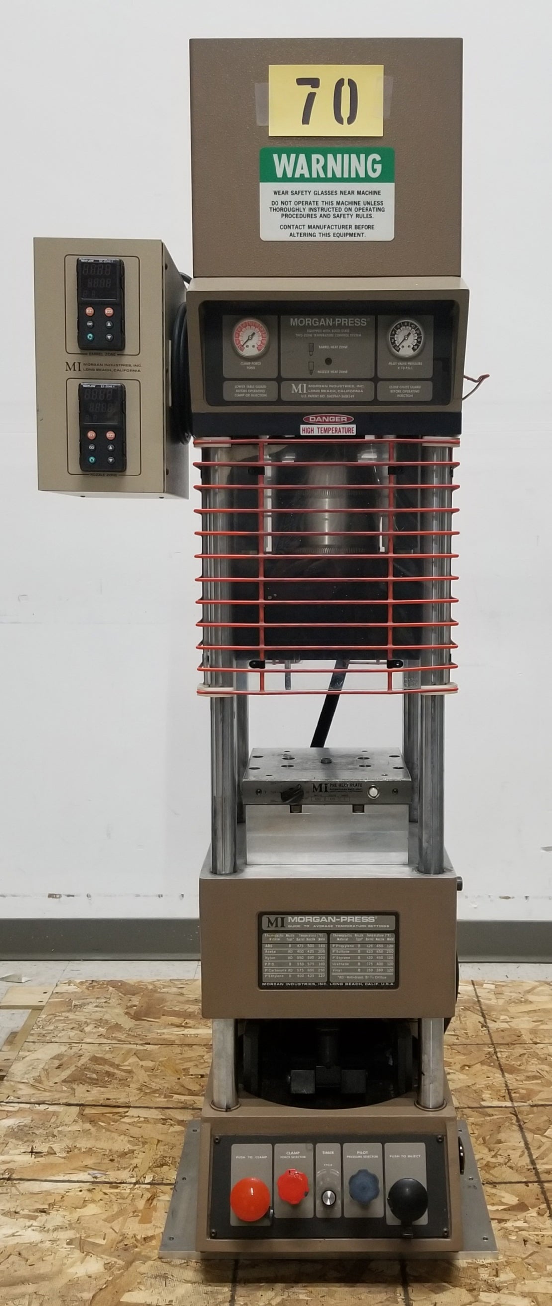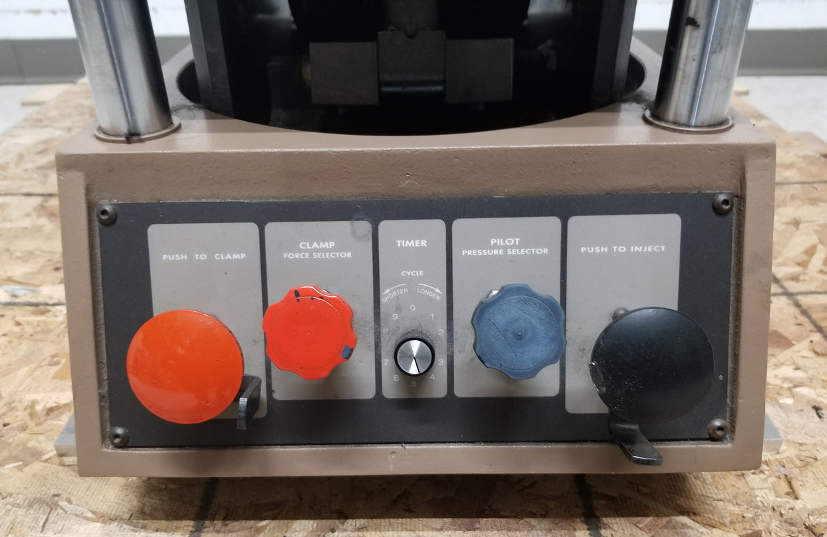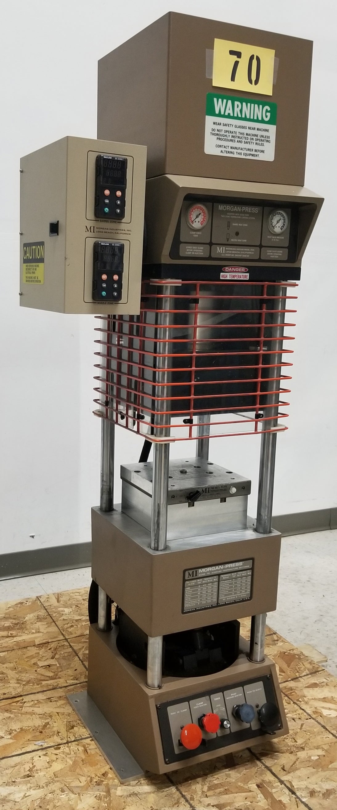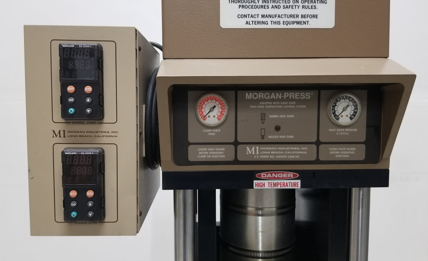 The Morgan-Press, Model G-100T, is an injection molder designed for practical and economical manufacturing of thermoplastic parts in quantities required for prototyping and low-volume production. It is primarily used for encapsulation, engineering prototypes, medical/dental devices, and marketing samples. The Morgan-Press is an ideal molder because it is easy to change molds and materials to make different parts. It is also capable of processing a full range of thermoplastic materials. The Model G-100T Morgan-Press Injection Molder has the following specifications: • 0 – 800 °F (0 – 430 °C) temperature control range • 6 cu. in. (4 oz.) maximum single shot • 20 ton maximum clamping force (toggle) • 12,000 psi maximum injection pressure • Utilities required: o Electrical: 120 volts AC o Compressed air