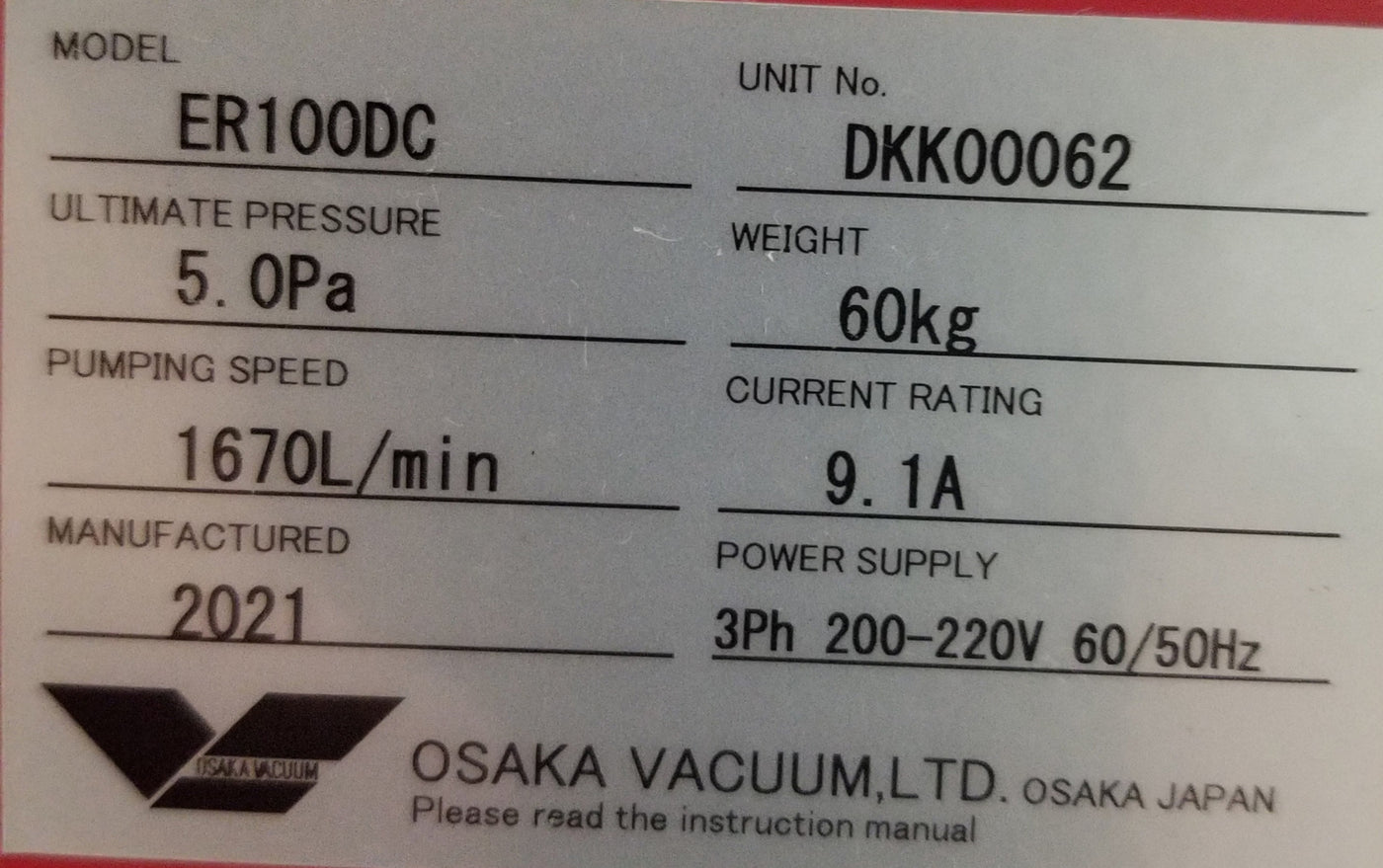 Used Osaka Vacuum ER100DC Dry Vacuum Pump